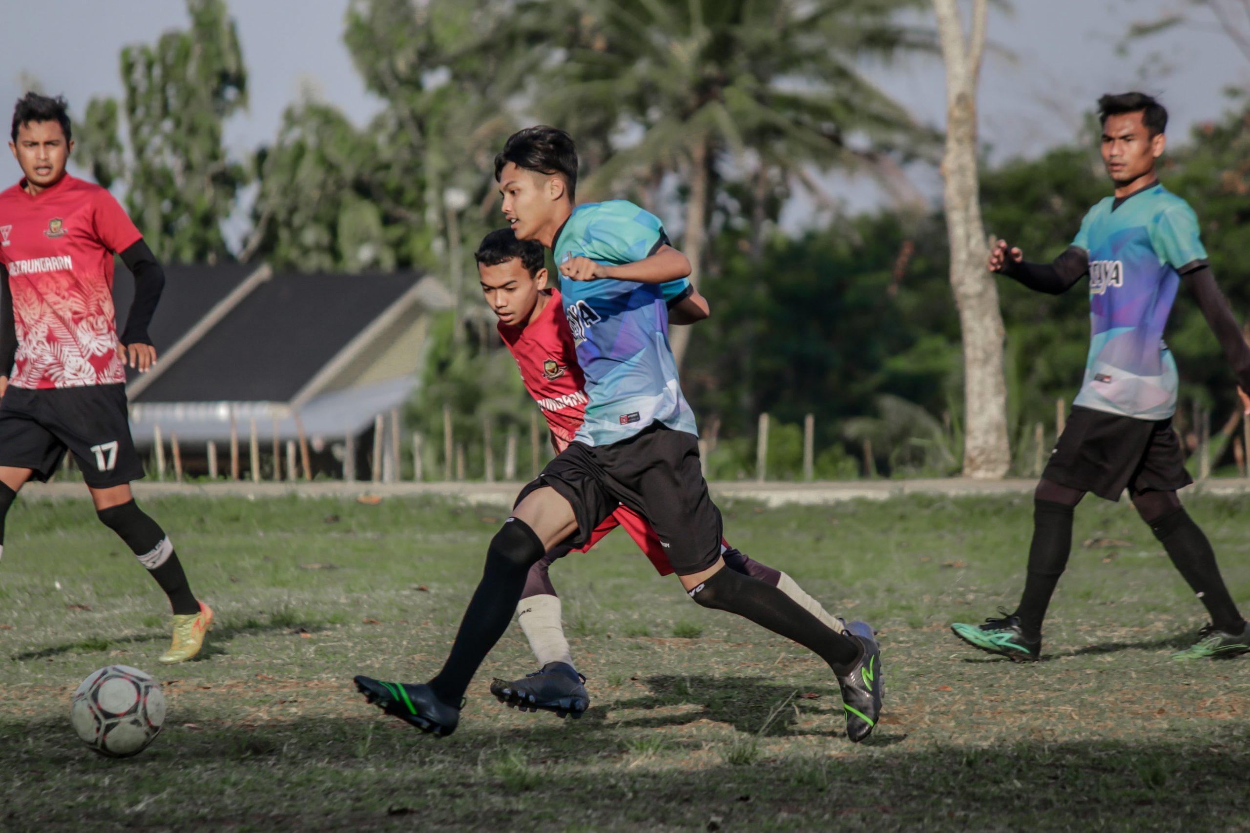 Aris yang menempati bek kanan Braya harus jatuh bangun dan jatuh lagi karena tak bisa mengejar kecepatan para pemain Gumarang FC.
