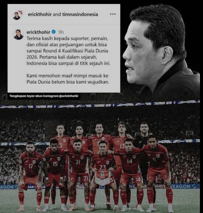 Ketua Umum PSSI, Erick Thohir, langsung menyampaikan permintaan maaf kepada seluruh rakyat Indonesia melalui akun media sosialnya. “Kami memohon maaf mimpi (Indonesia) masuk ke Piala Dunia 2026 belum bisa kami wujudkan,” tulis Erick Thohir, Minggu (12/10/2025).